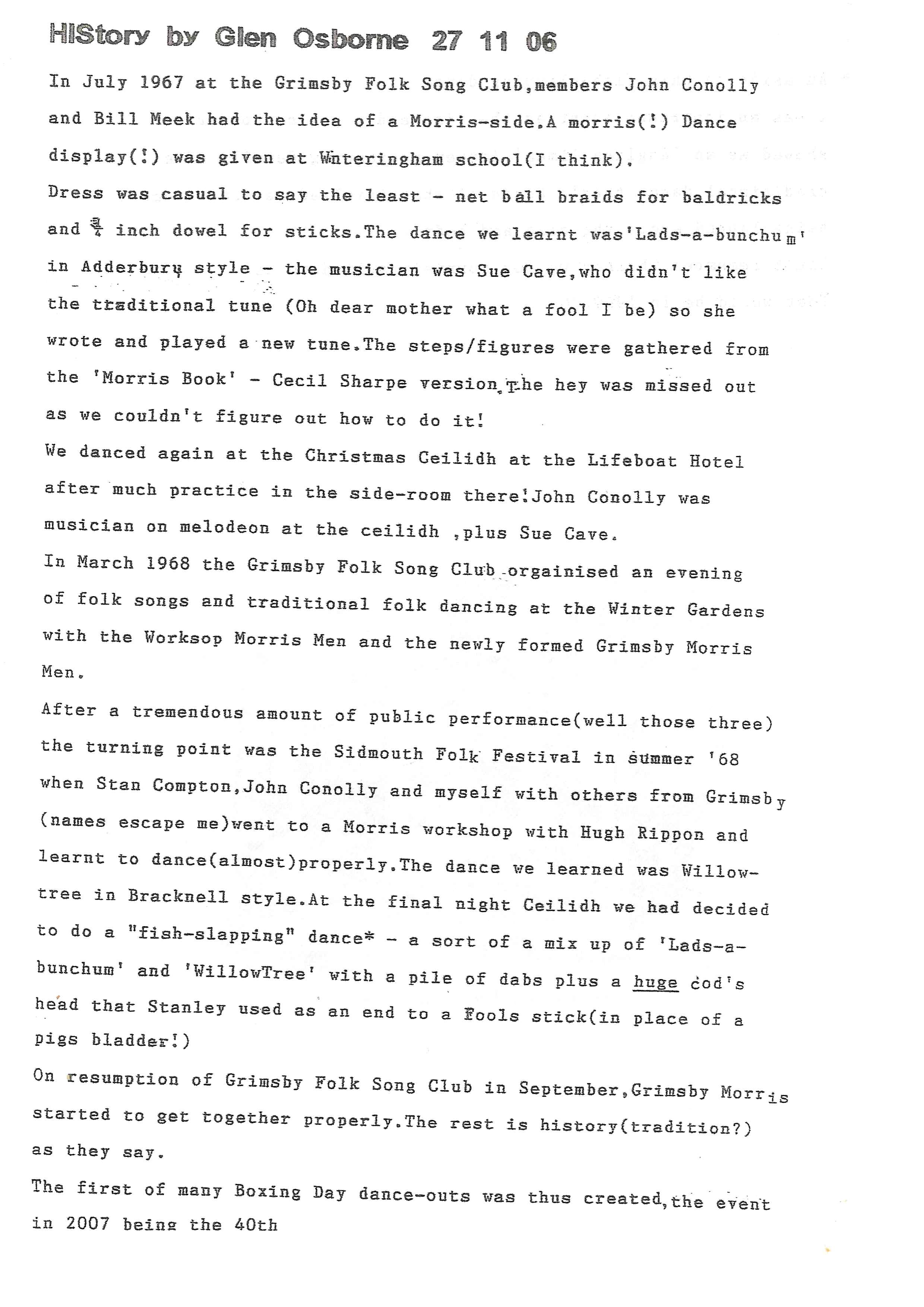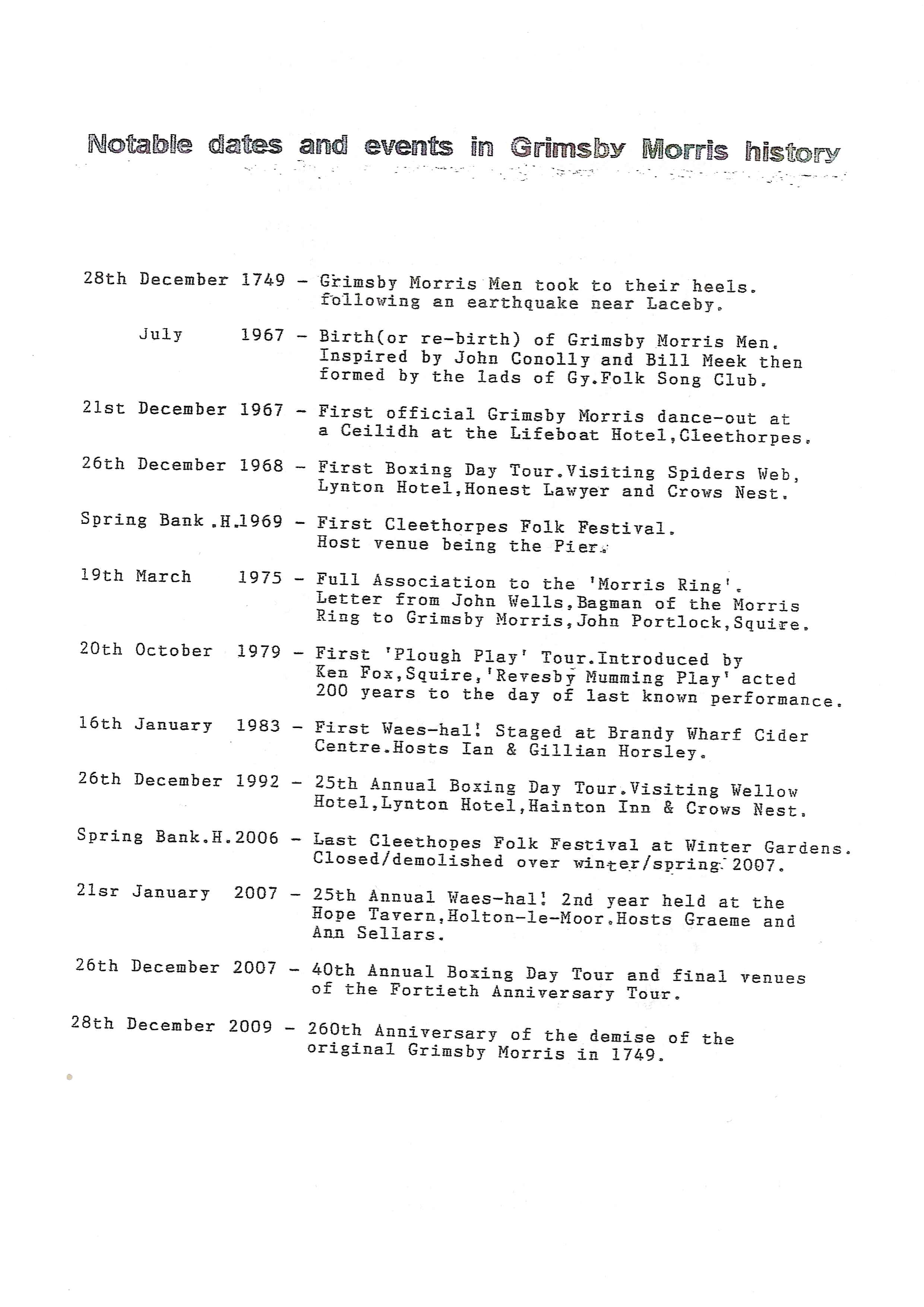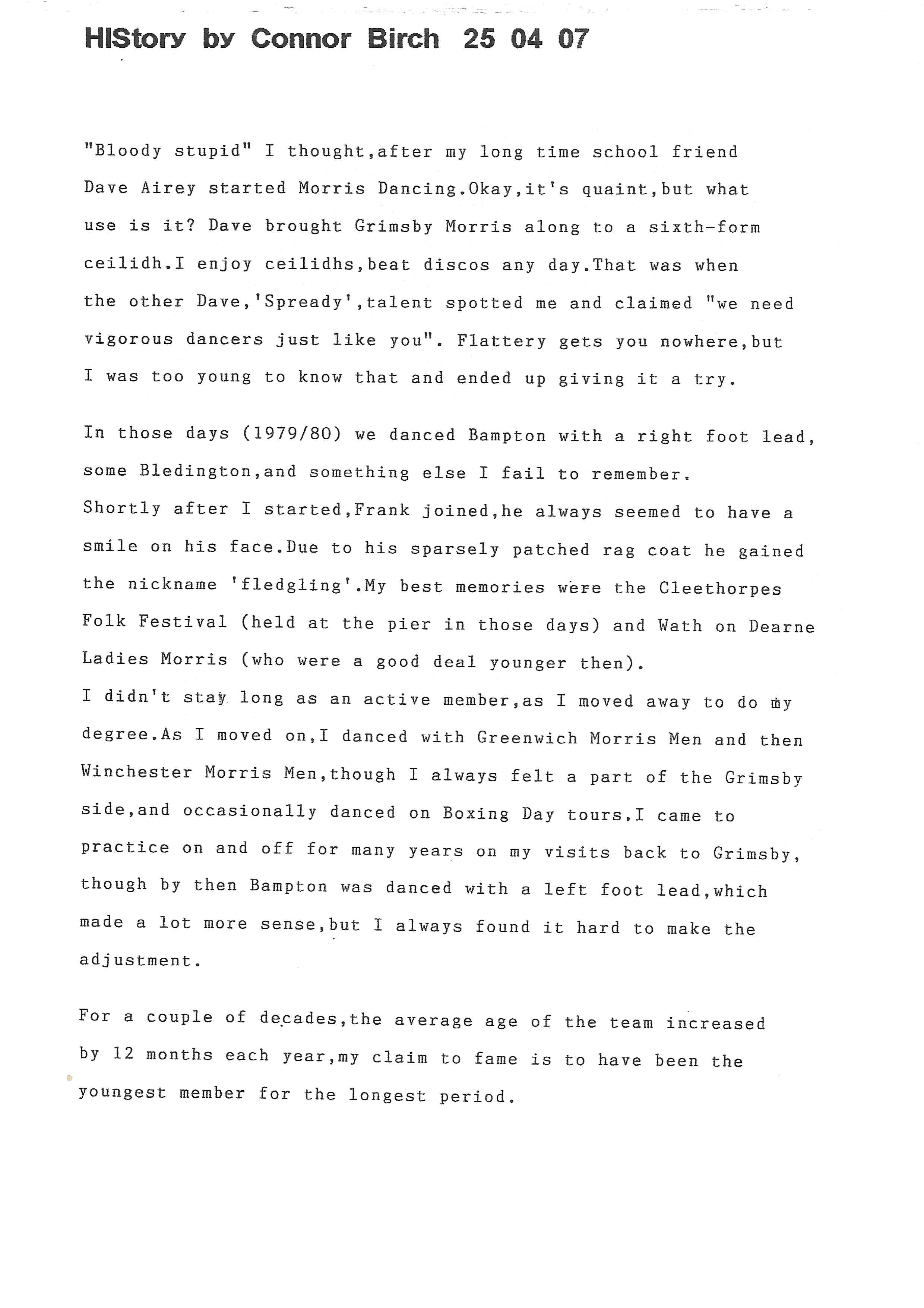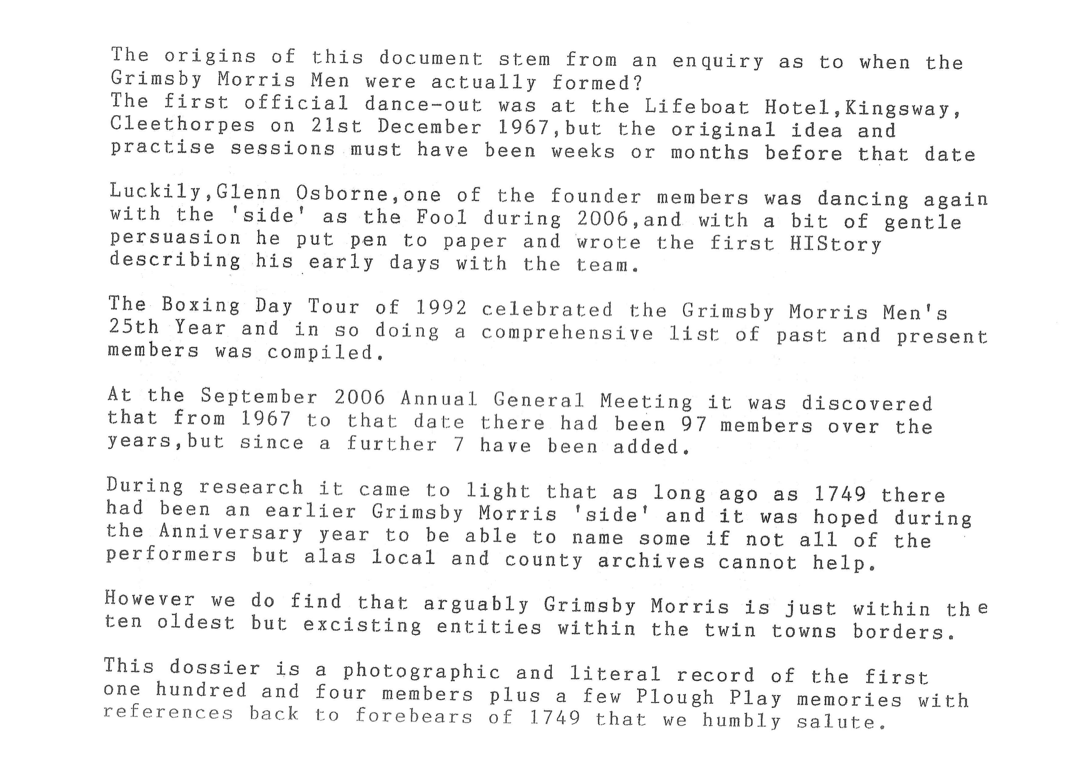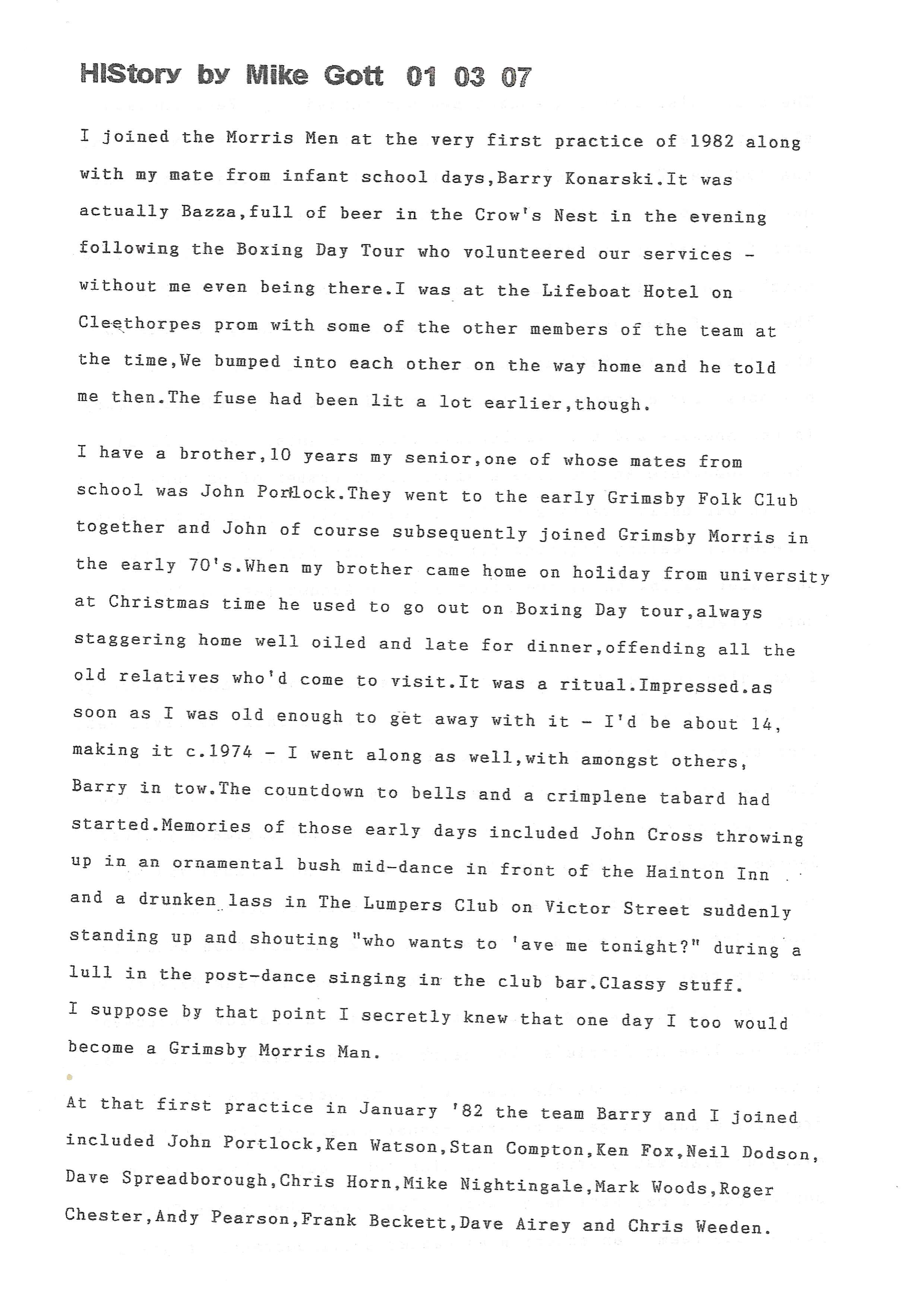 The Histories are a series of books collated by Ian Horsley documenting the history of Grimsby Morris and the dancers and musicians of the side. This first book was assembled from various documents in the archive for the side's 40th anniversary in 2007.