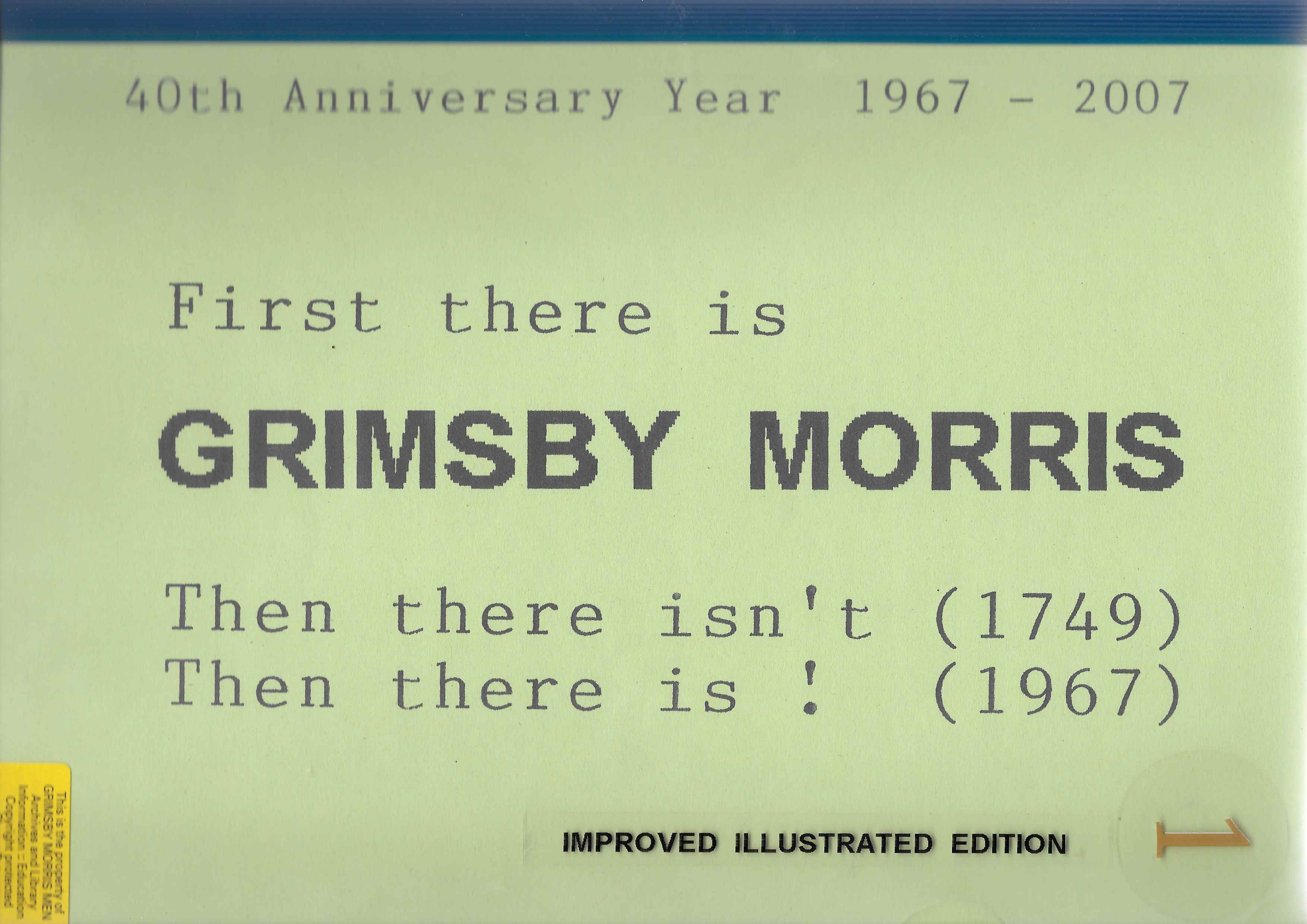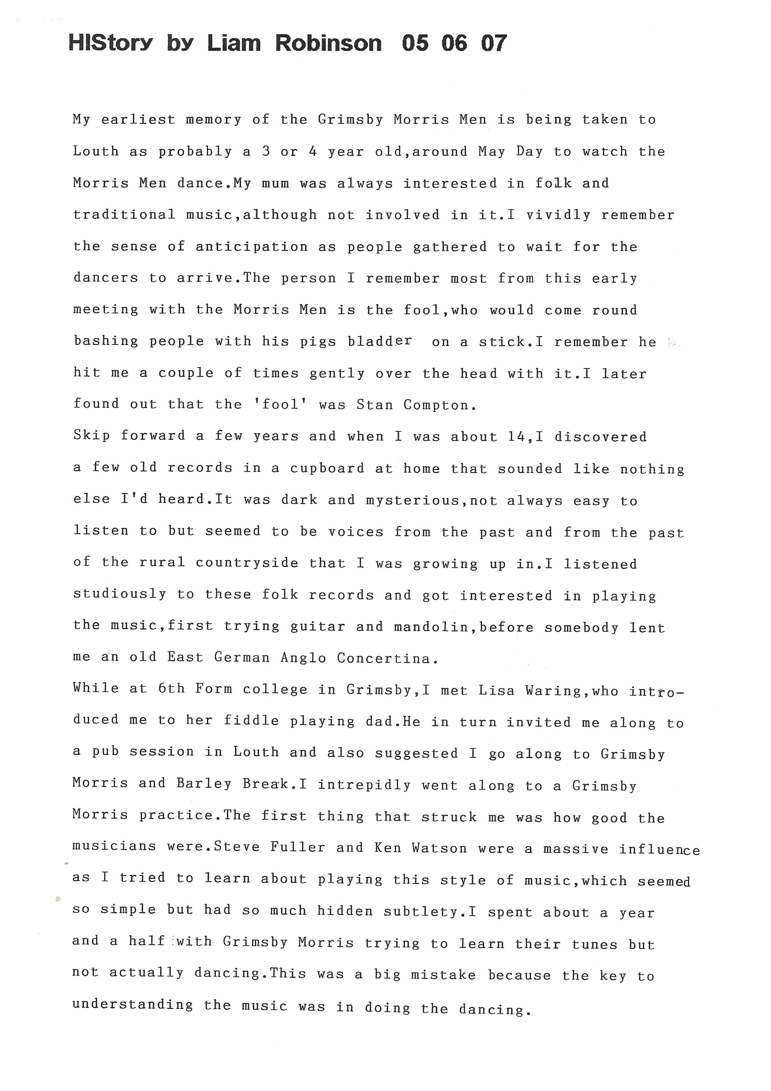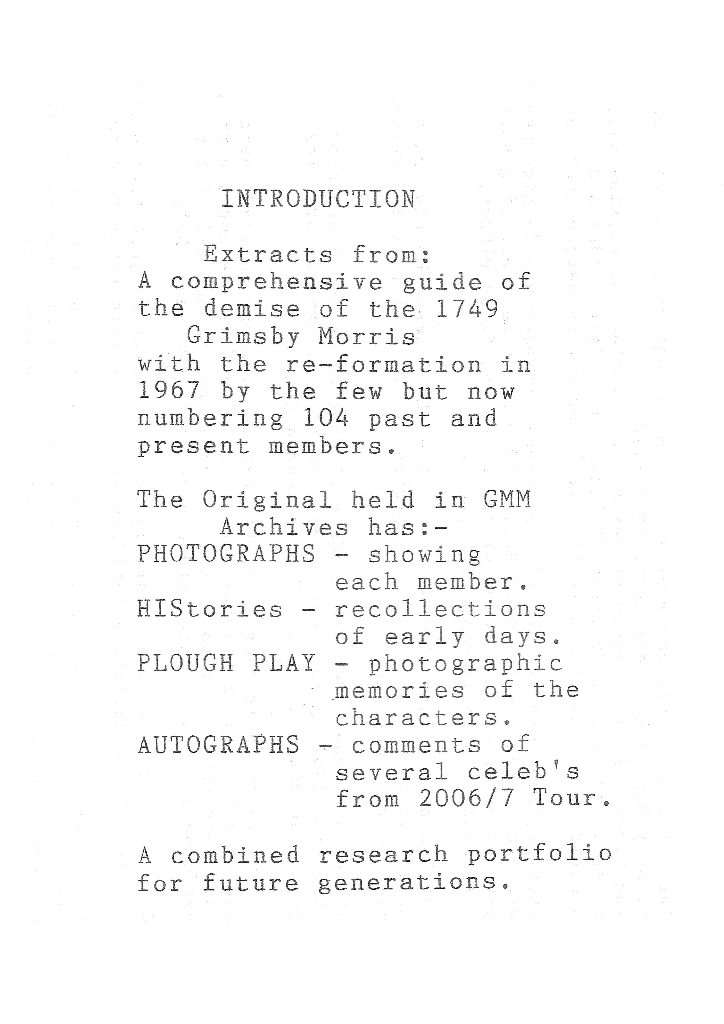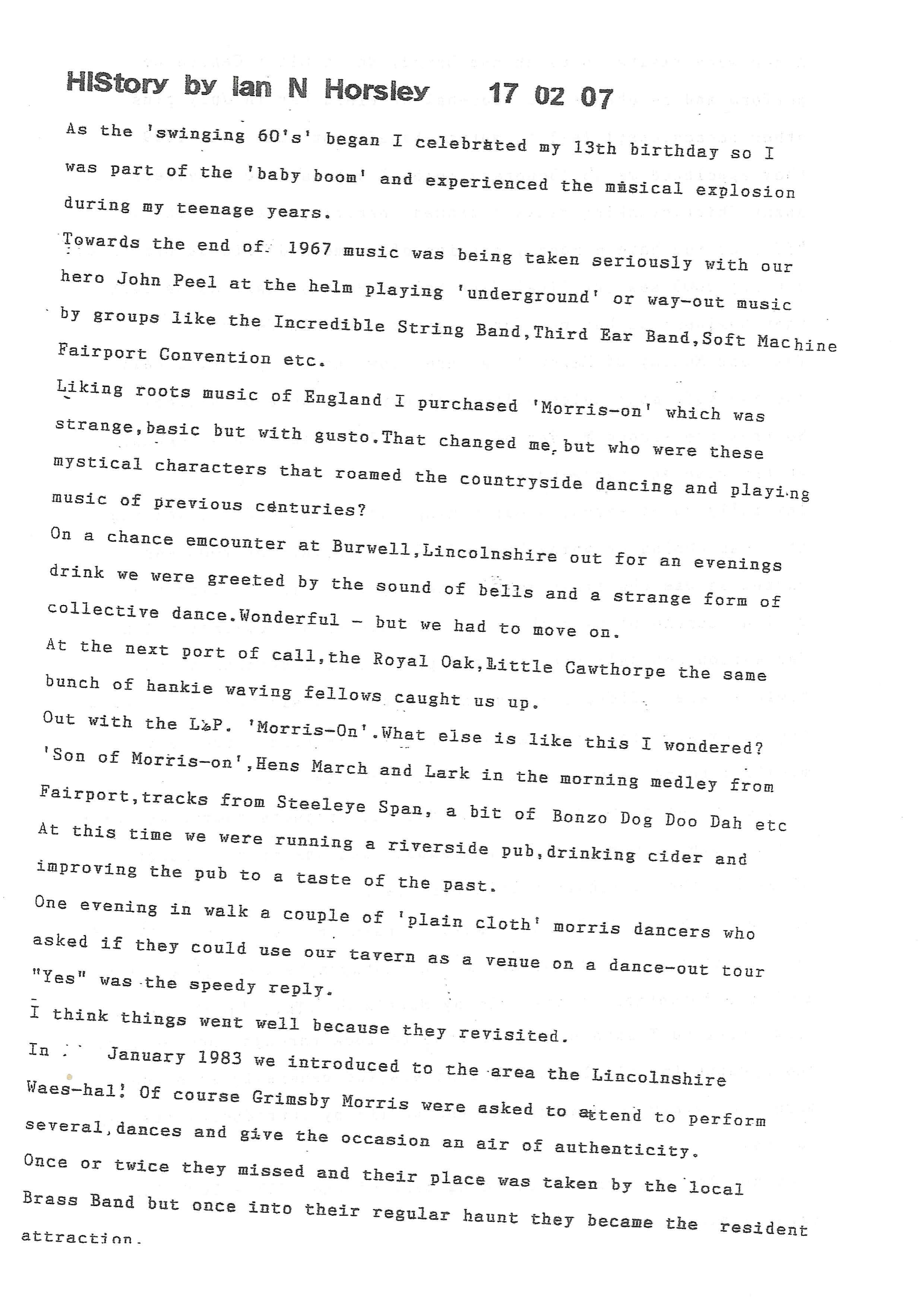 The Histories are a series of books collated by Ian Horsley documenting the history of Grimsby Morris and the dancers and musicians of the side. This first book was assembled from various documents in the archive for the side's 40th anniversary in 2007.