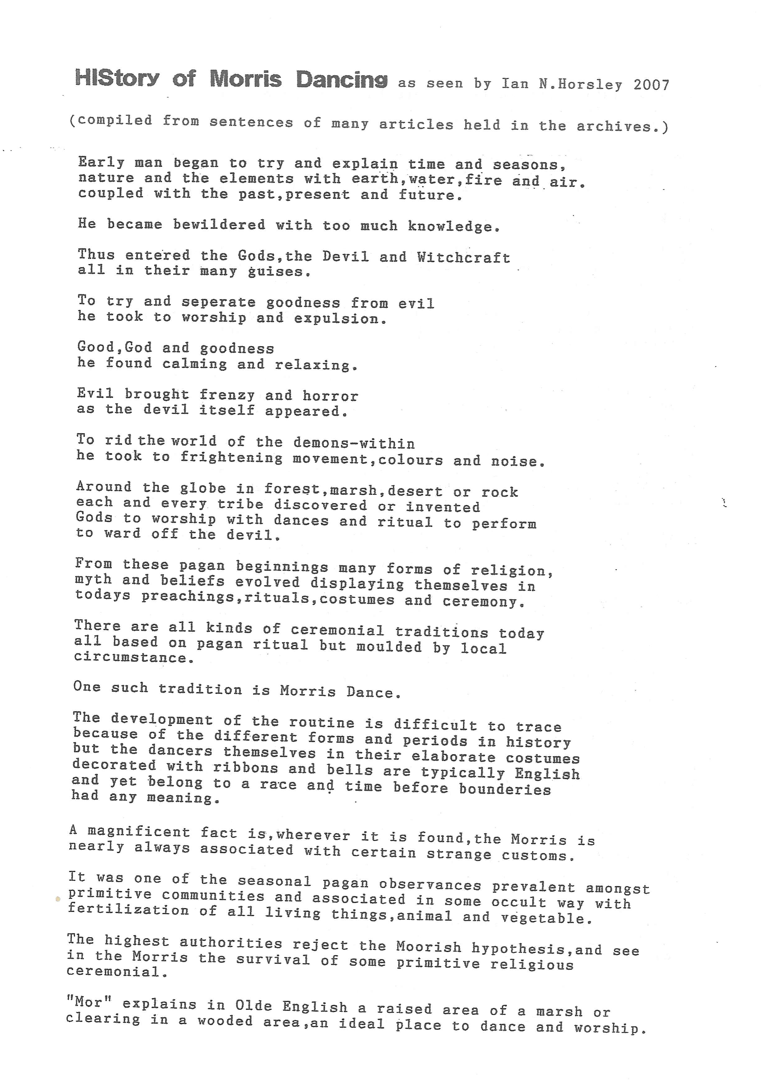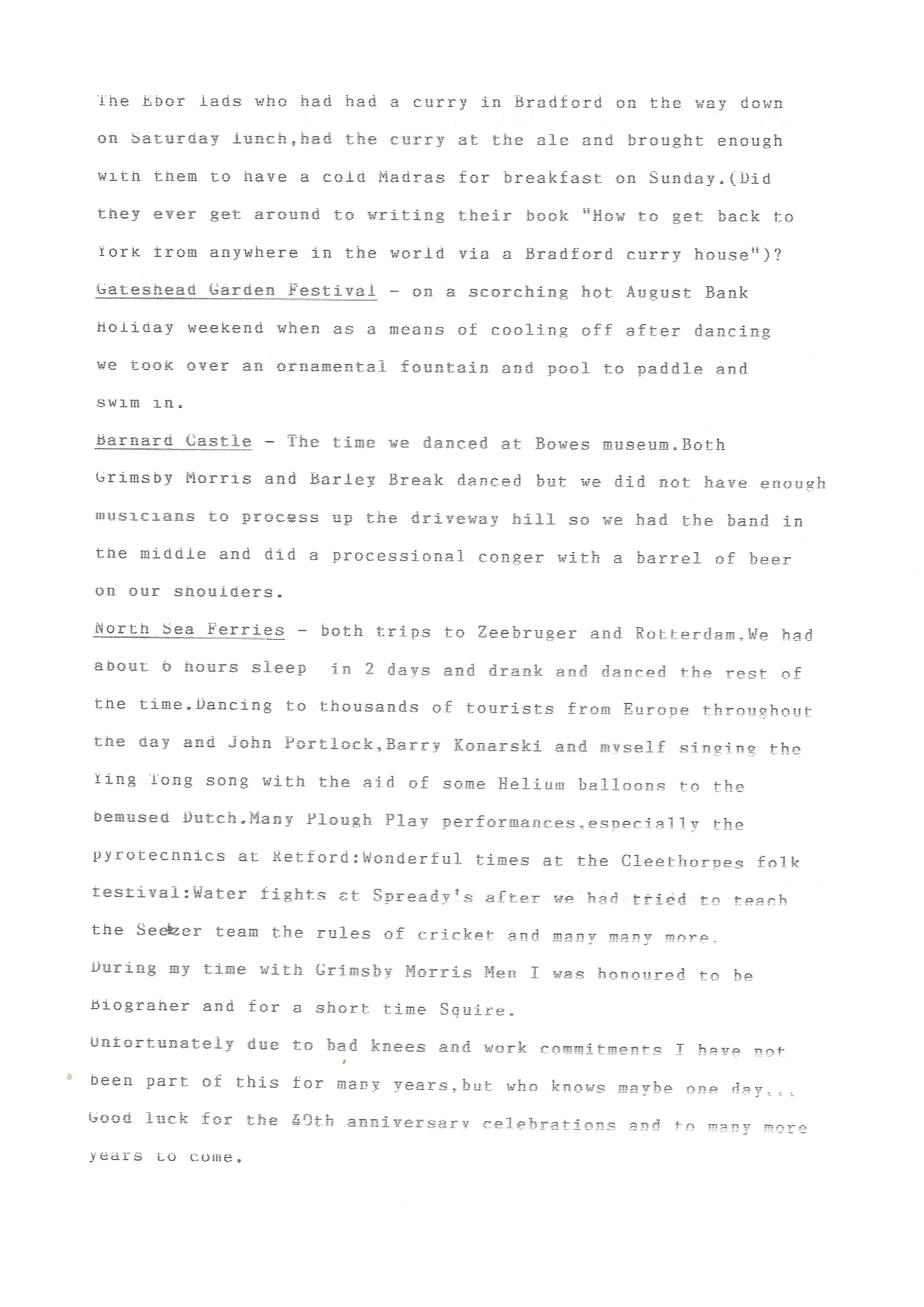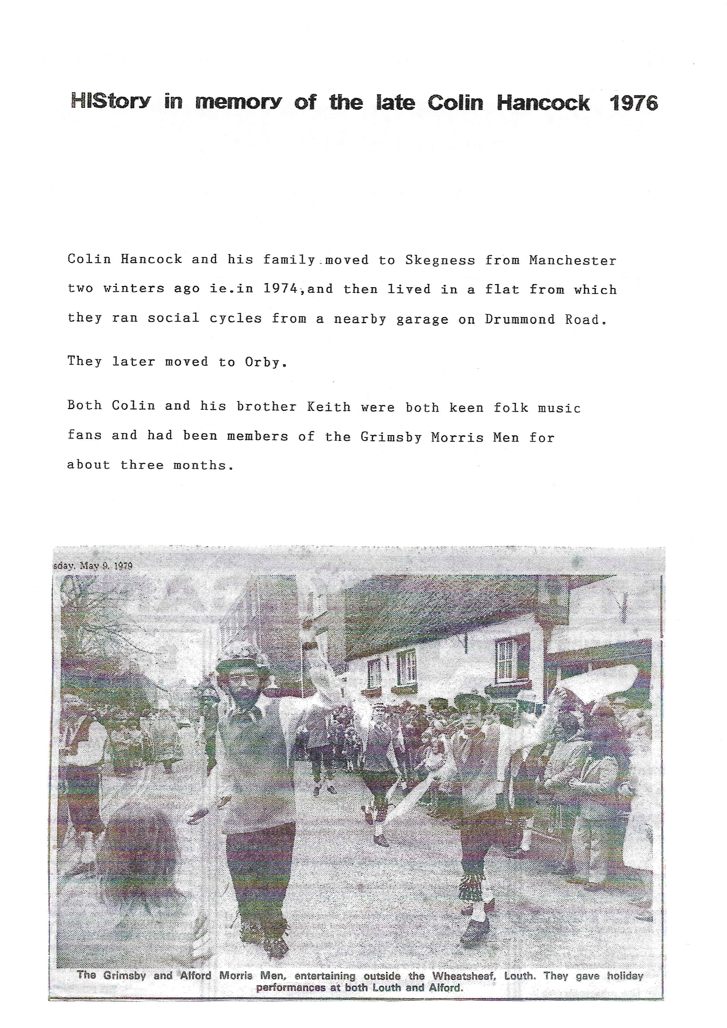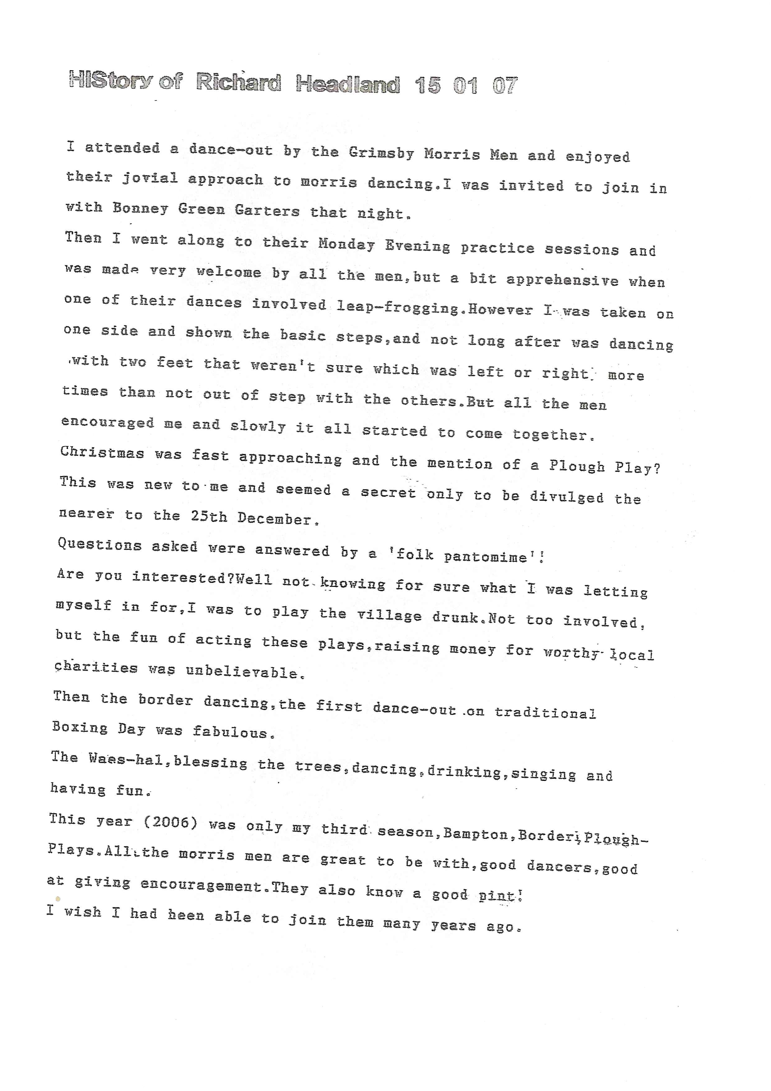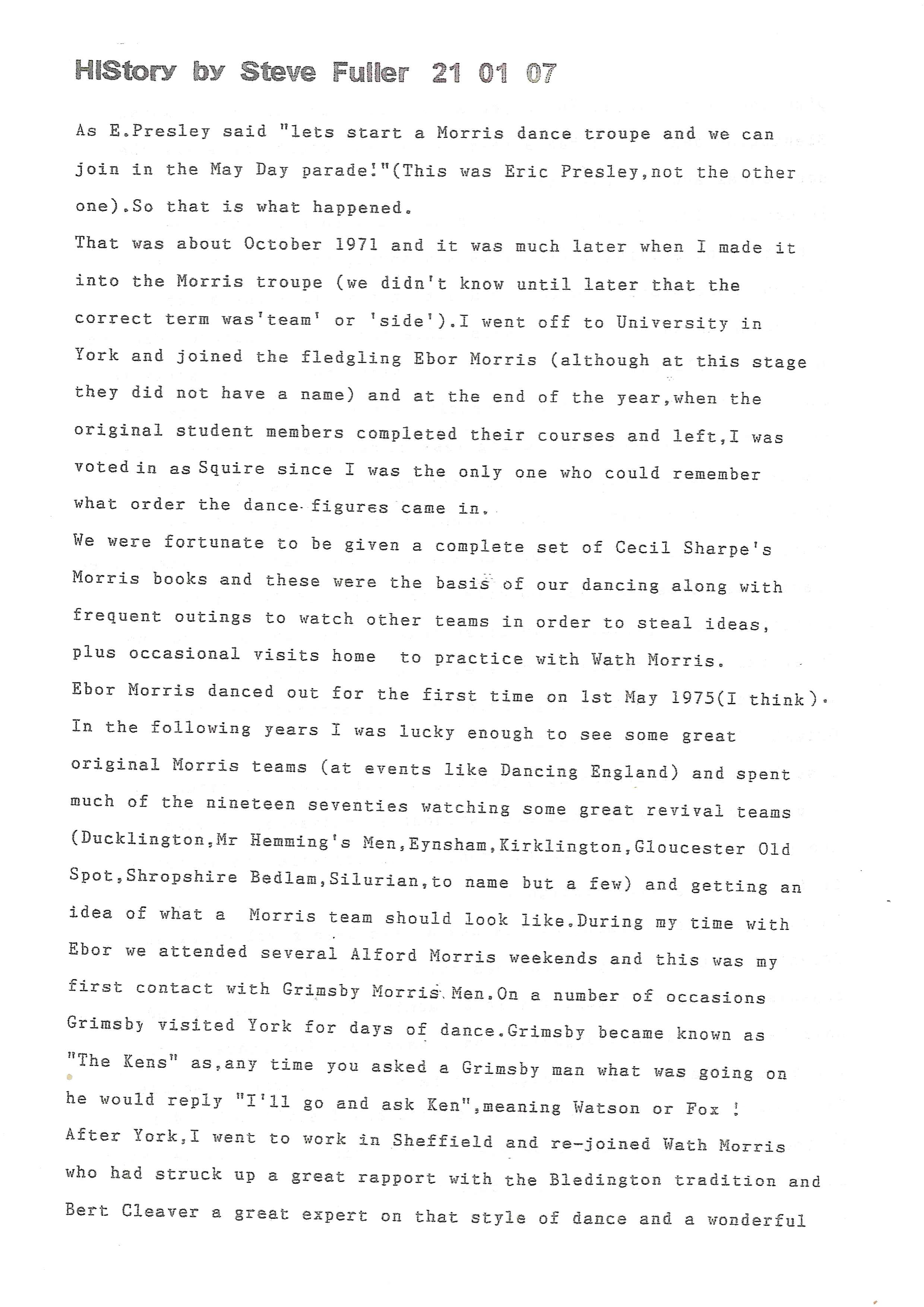 The Histories are a series of books collated by Ian Horsley documenting the history of Grimsby Morris and the dancers and musicians of the side. This first book was assembled from various documents in the archive for the side's 40th anniversary in 2007.