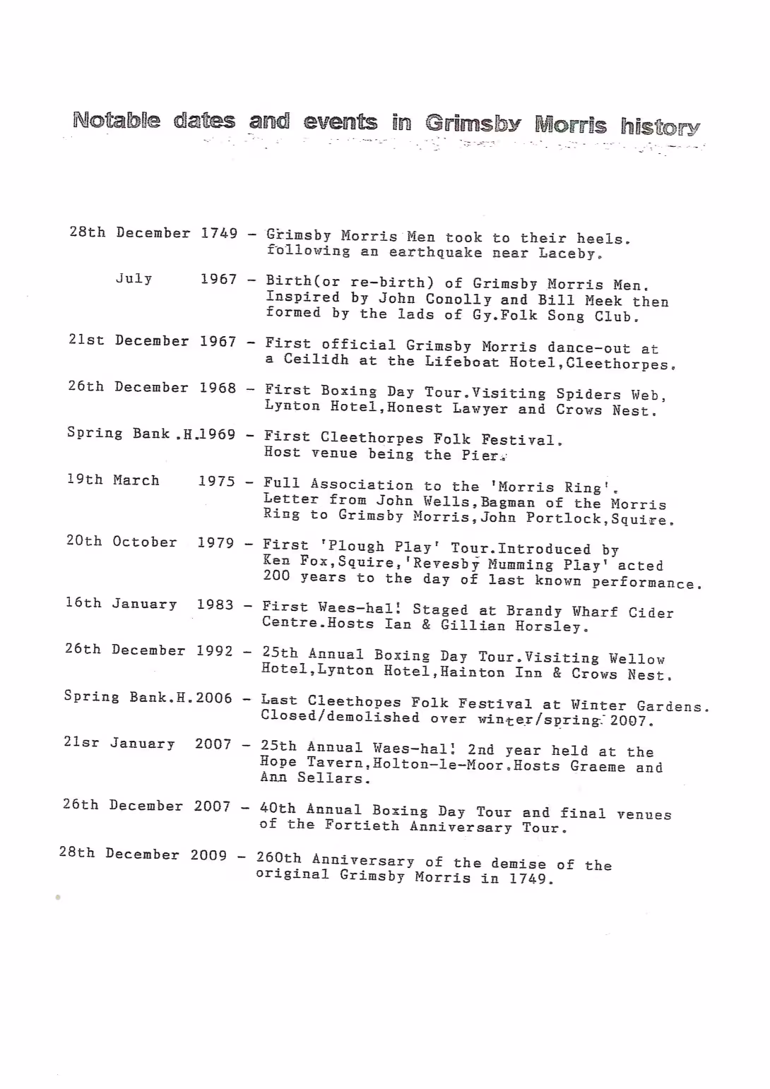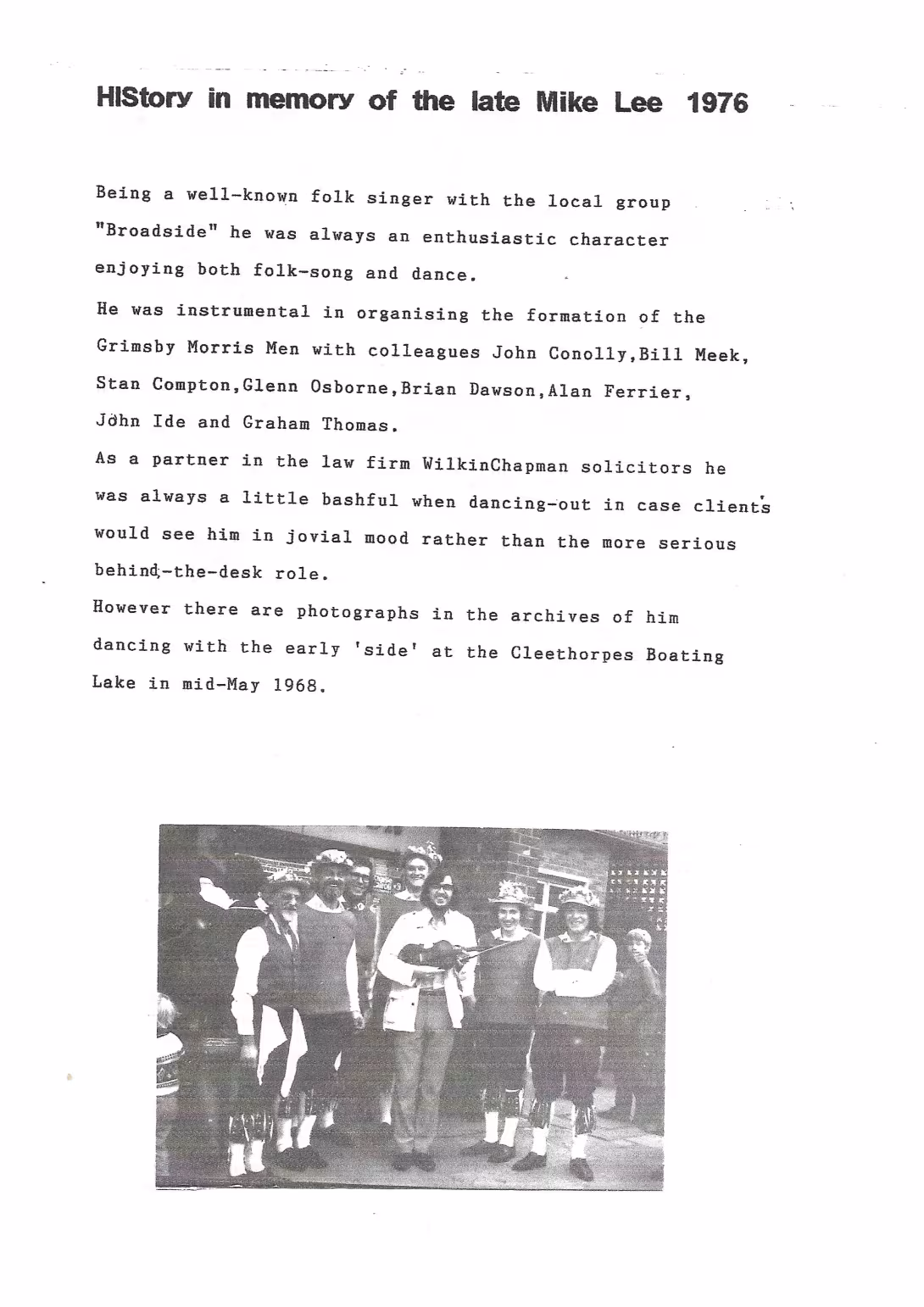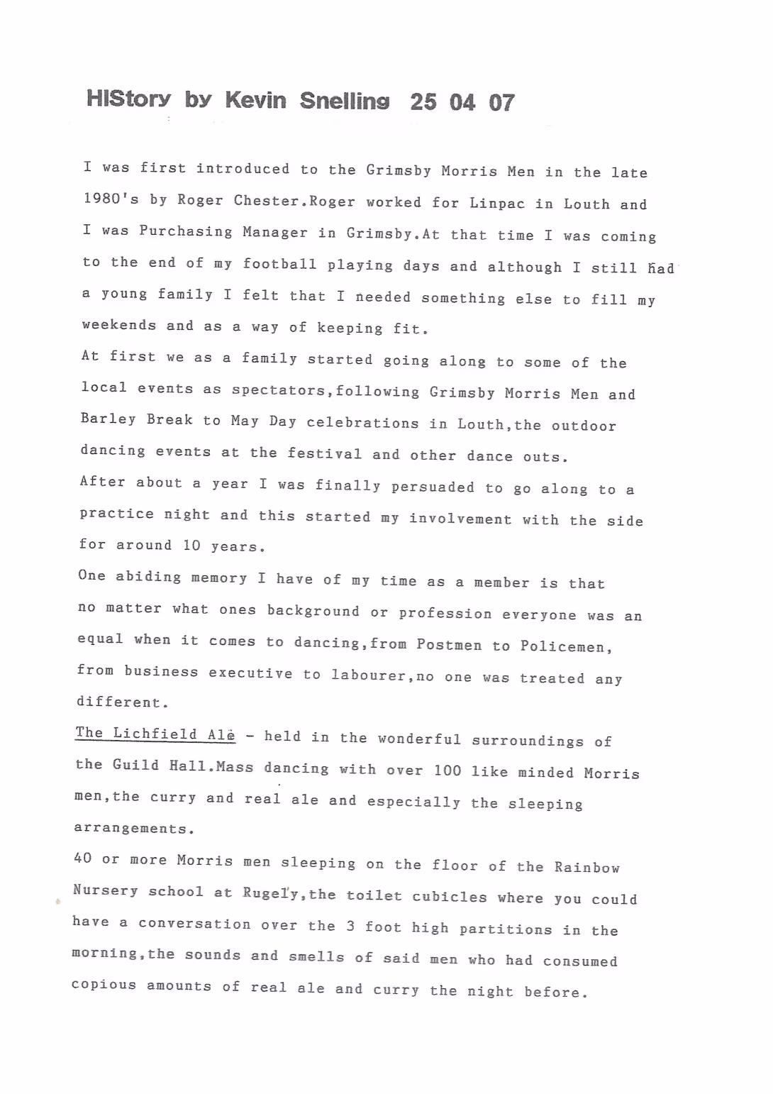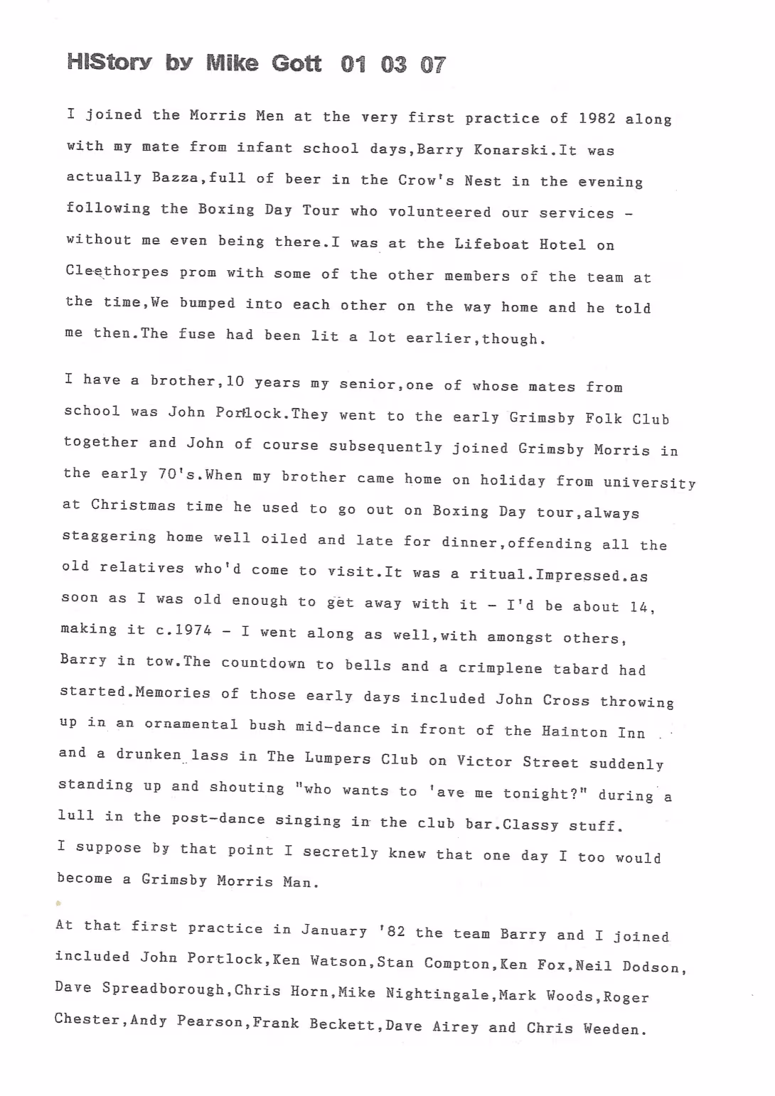 The Histories are a series of books collated by Ian Horsley documenting the history of Grimsby Morris and the dancers and musicians of the side. This first book was assembled from various documents in the archive for the side's 40th anniversary in 2007.