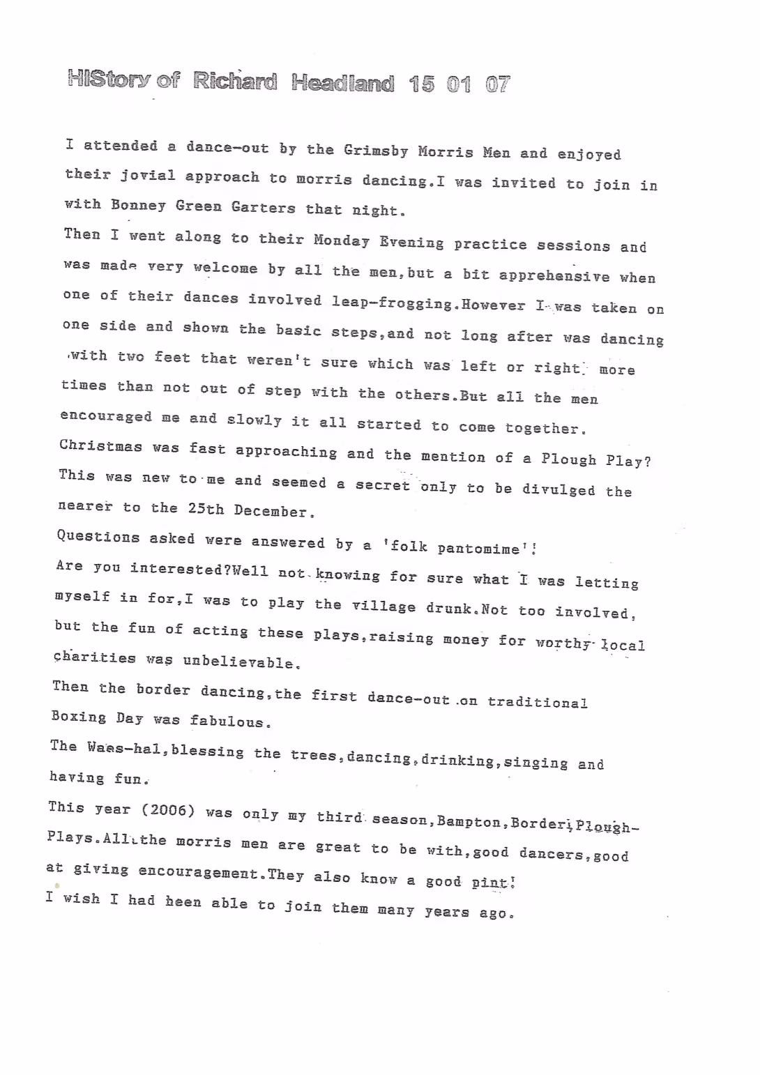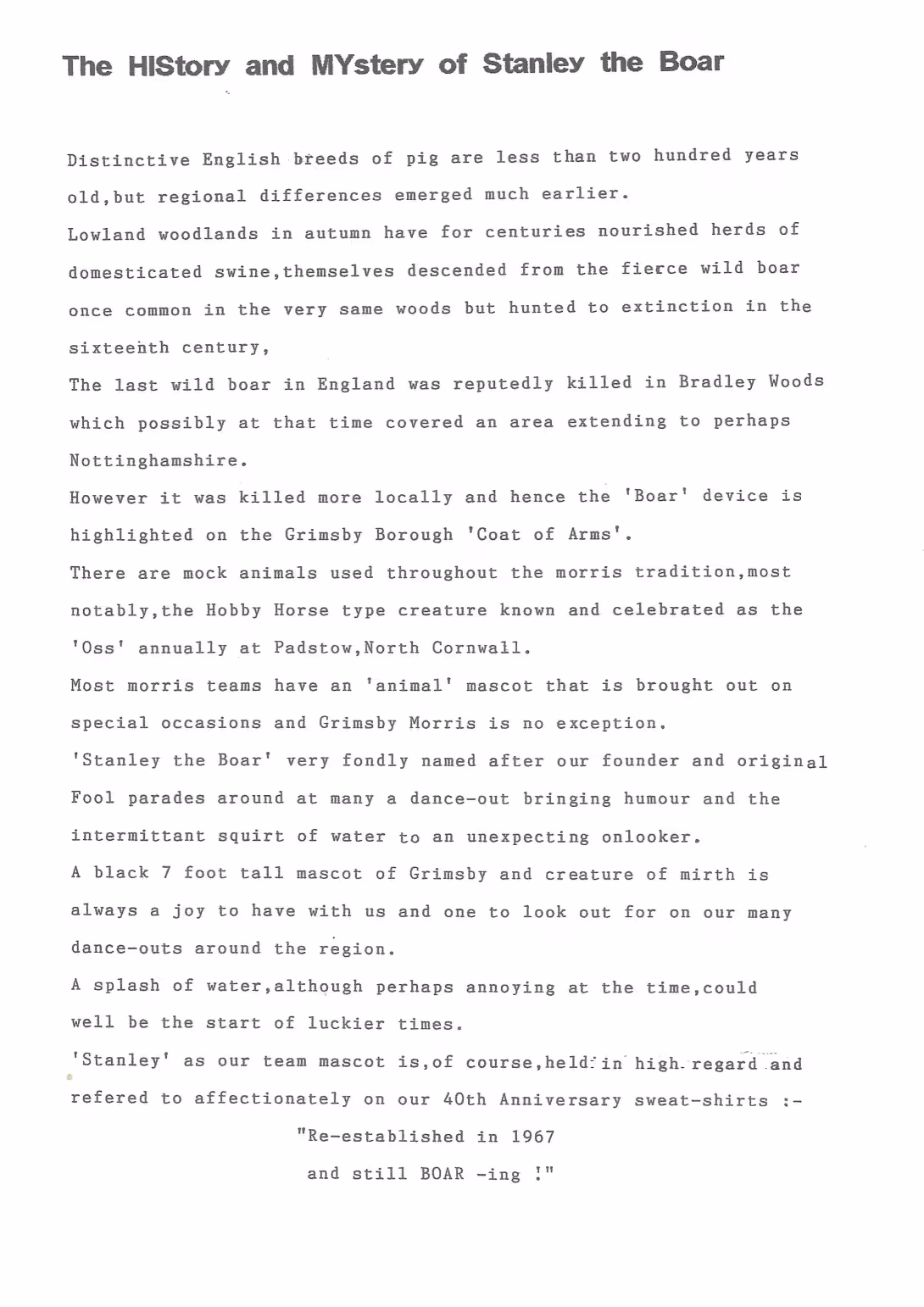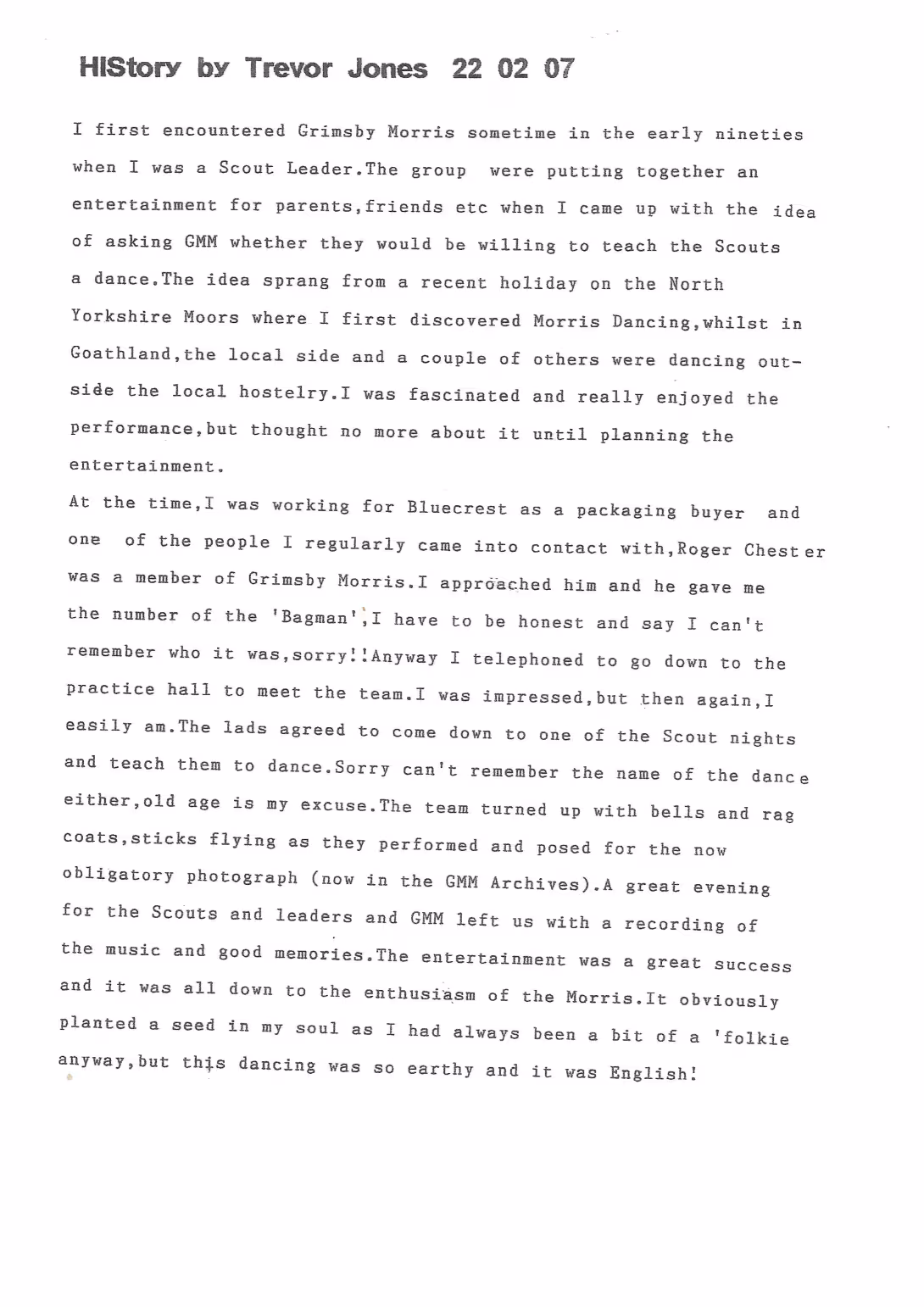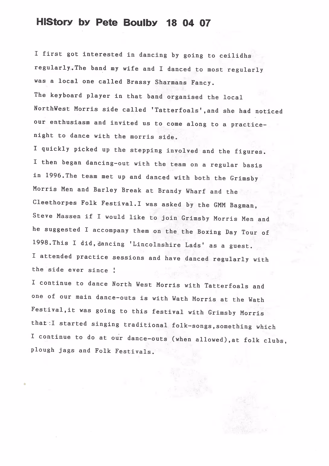 The Histories are a series of books collated by Ian Horsley documenting the history of Grimsby Morris and the dancers and musicians of the side. This first book was assembled from various documents in the archive for the side's 40th anniversary in 2007.