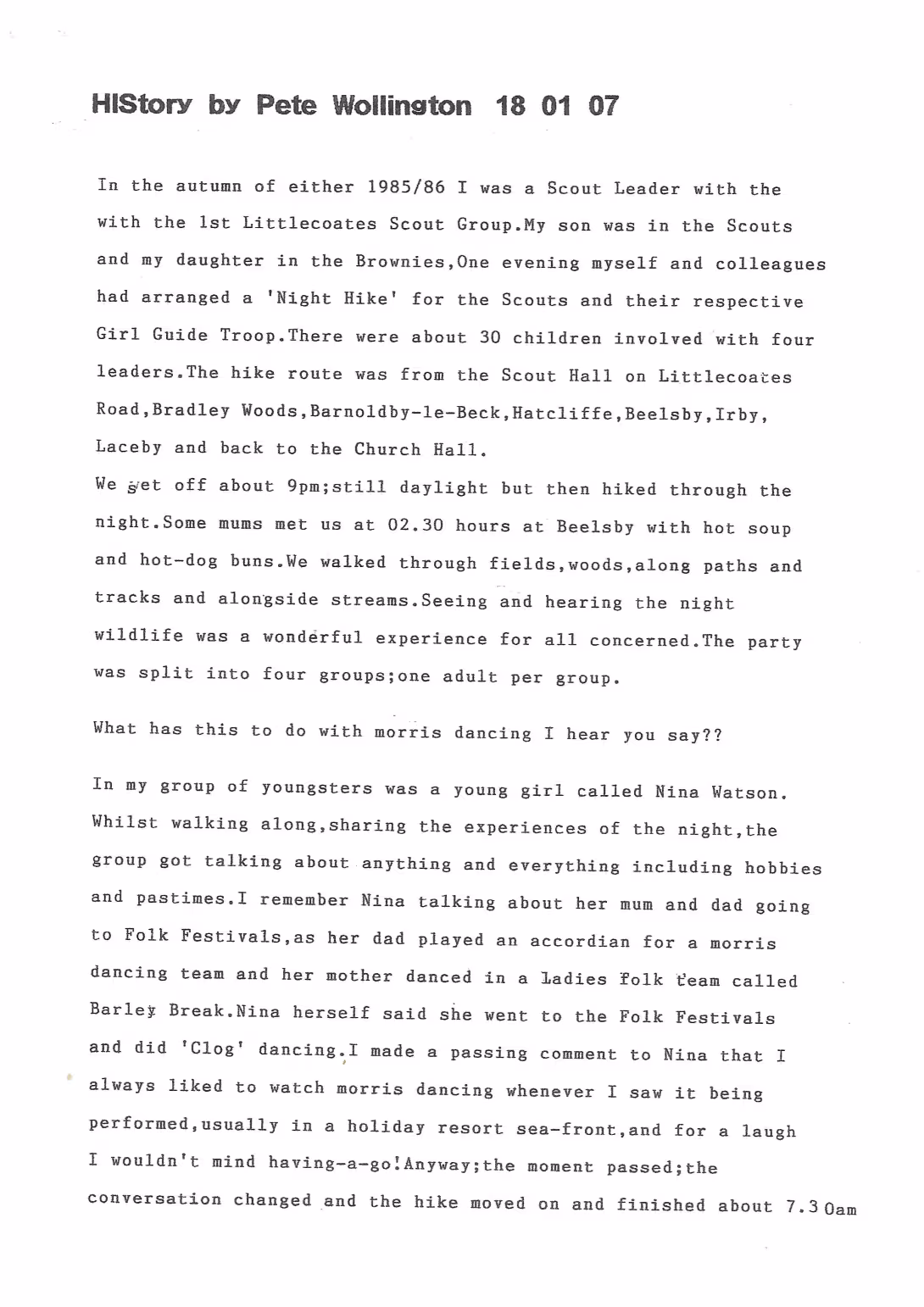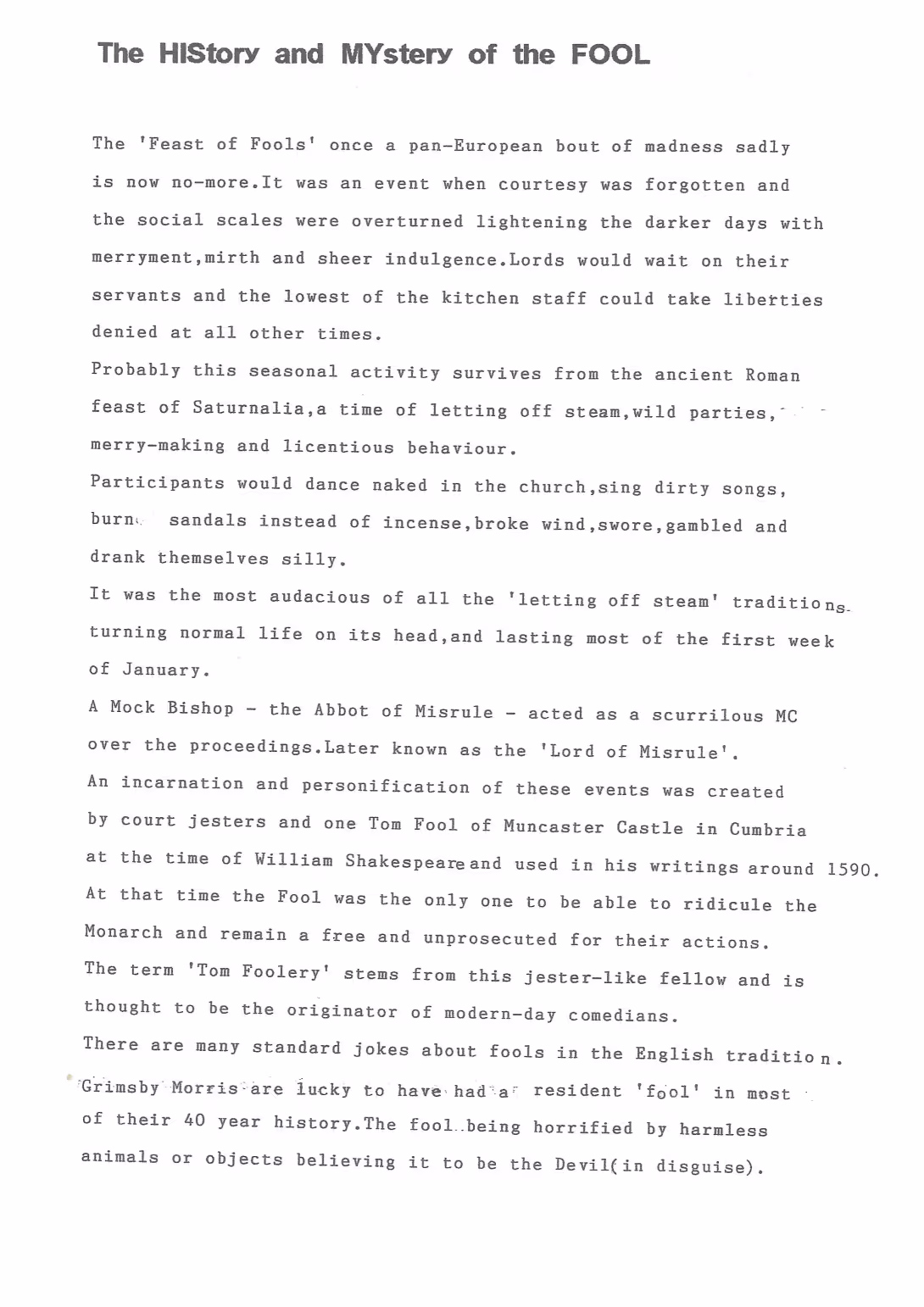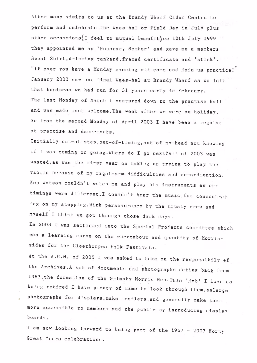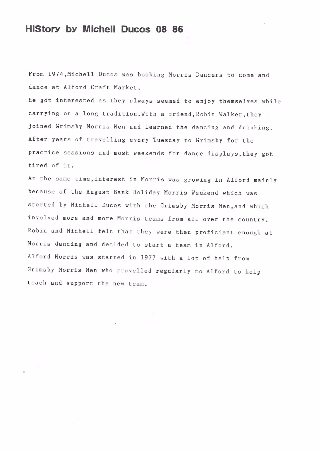 The Histories are a series of books collated by Ian Horsley documenting the history of Grimsby Morris and the dancers and musicians of the side. This first book was assembled from various documents in the archive for the side's 40th anniversary in 2007.