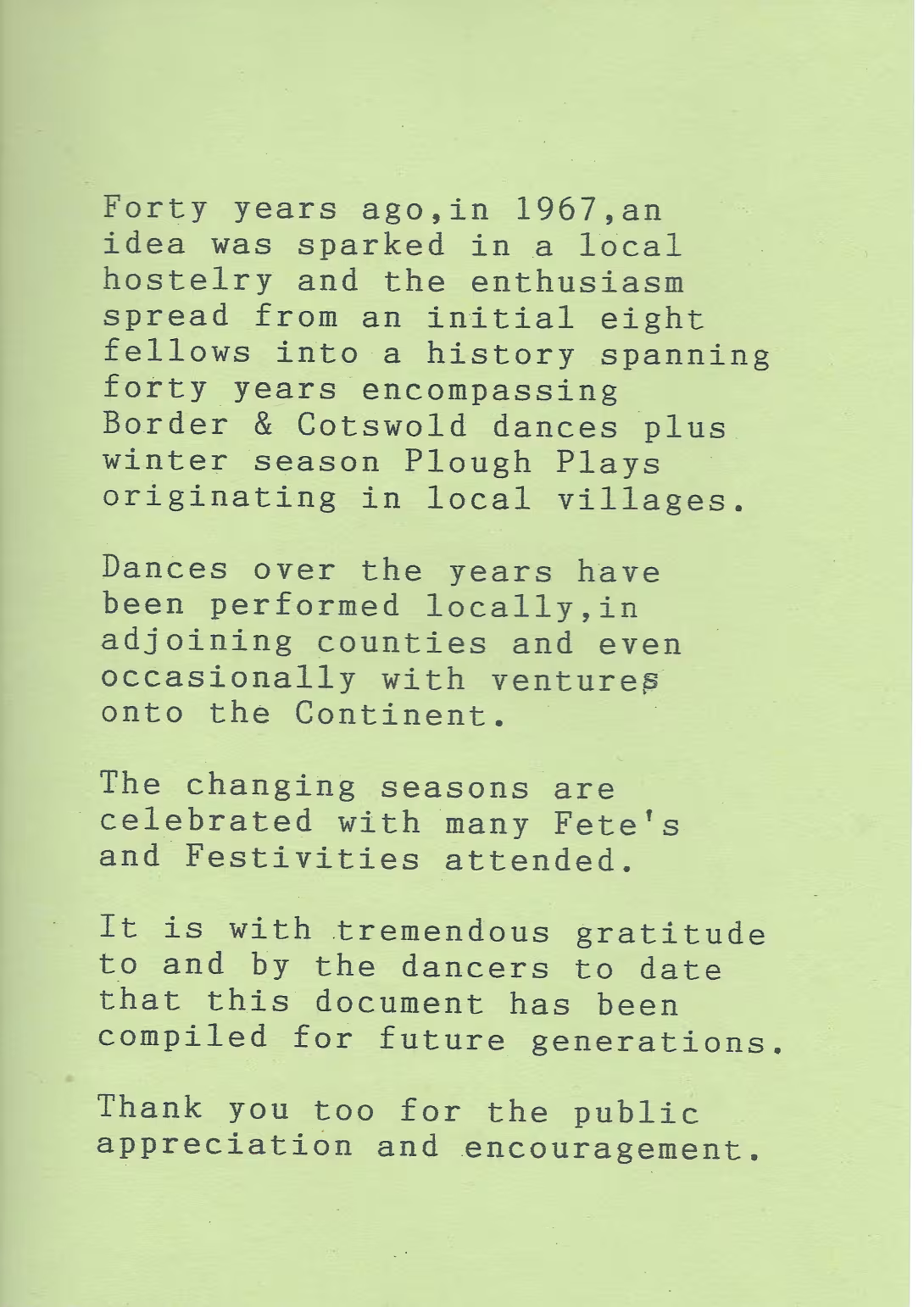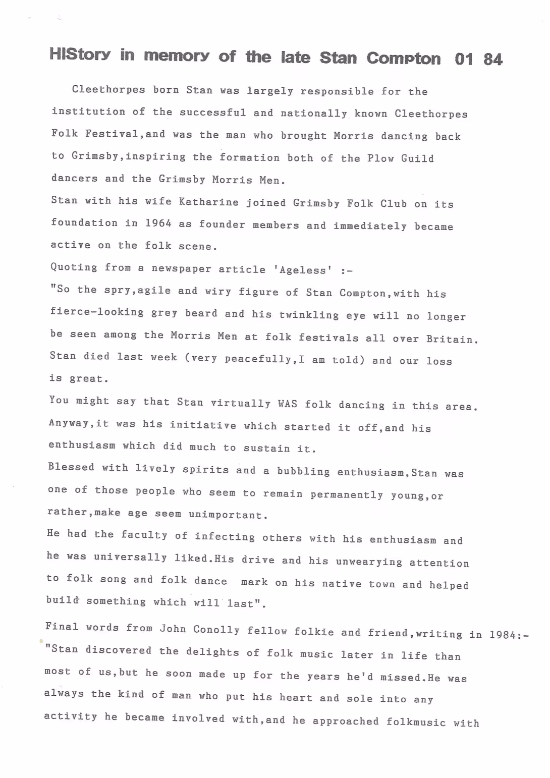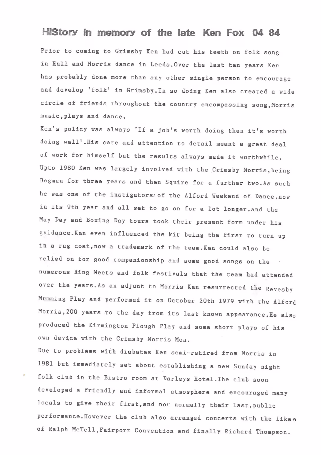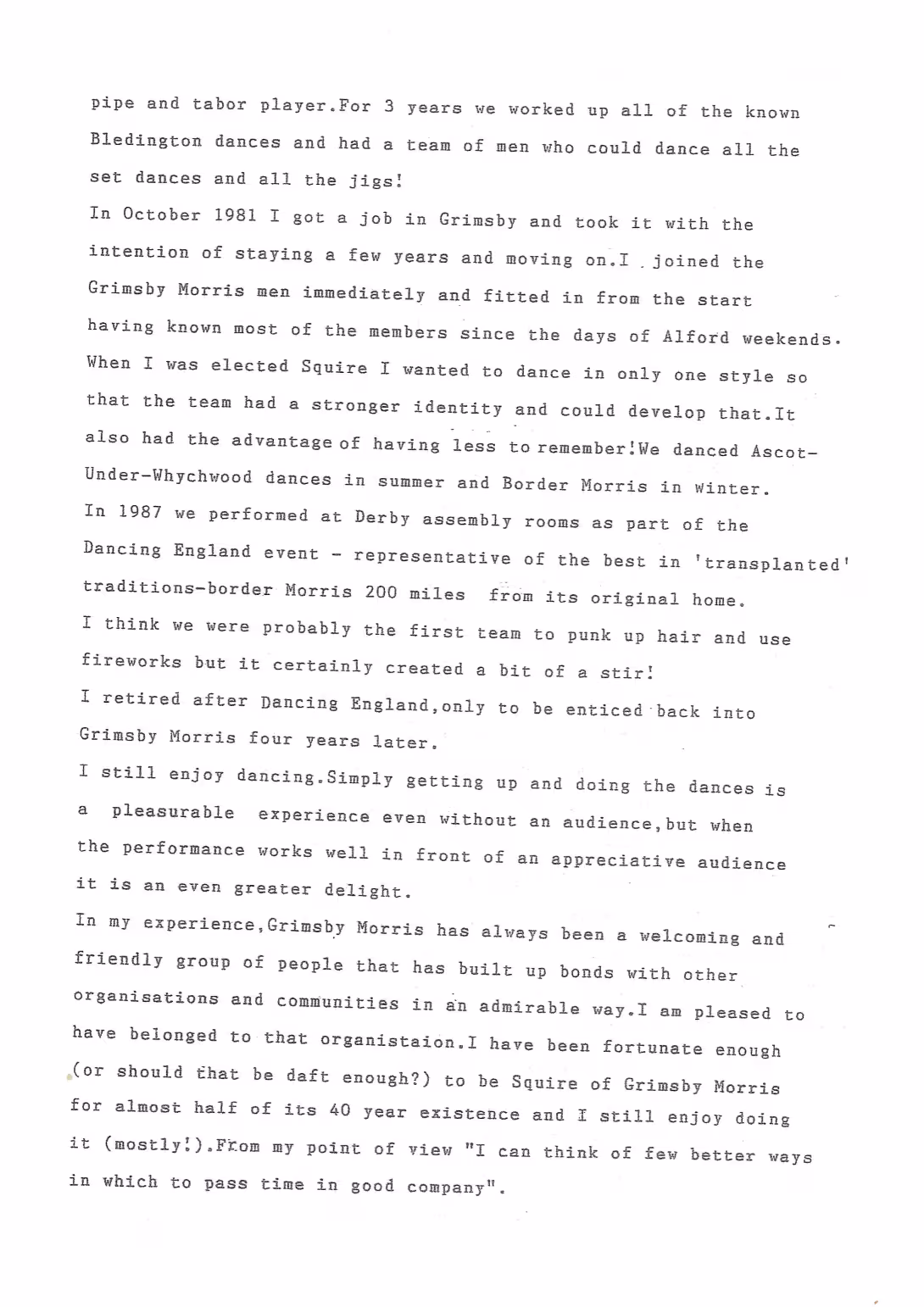 The Histories are a series of books collated by Ian Horsley documenting the history of Grimsby Morris and the dancers and musicians of the side. This first book was assembled from various documents in the archive for the side's 40th anniversary in 2007.
